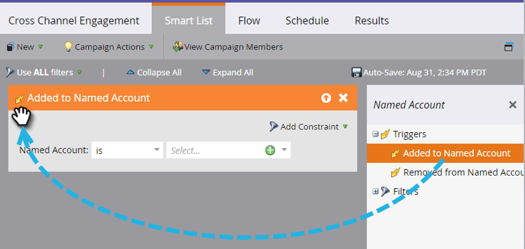 Arrastre el déclencheur que desee al lienzo. En este ejemplo utilizamos Se agregó a la cuenta con nombre.
