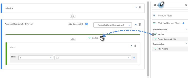 PASO OPCIONAL: Aquí es donde entran los contenedores. Si elige un filtro de persona coincidente adicional, puede soltarlo debajo del primero o en, creando un contenedor. En este ejemplo creamos un contenedor al agregar El puesto es CFO.