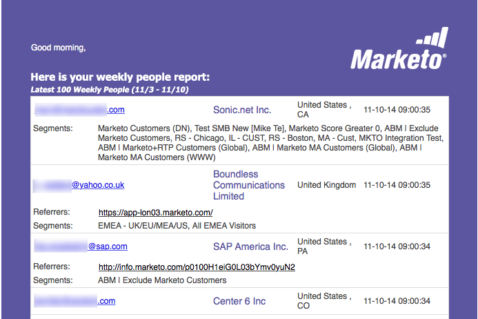El informe de personas diario/semanal envía al usuario un correo electrónico con las últimas 100 personas del sitio web según la dirección de correo electrónico de la persona, el nombre de la organización, la ubicación, el estado, la fecha de captura de la persona y los segmentos a los que pertenece la persona.