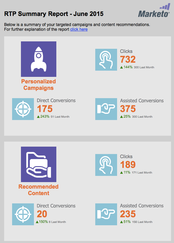 El informe Resumen envía al usuario un correo electrónico (mensual o trimestral) con el rendimiento de todas las campañas y el contenido recomendado en función del número de clics y el número de personas (directas o asistidas) que participaron en la campaña personalizada o el contenido recomendado y que luego se convirtieron en personas conocidas. El informe compara los resultados con los del mes o trimestre anterior.