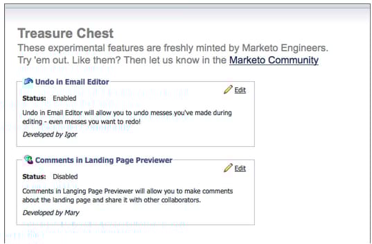 Obtenga acceso a las funciones experimentales desarrolladas por ingenieros de Marketo para mejorar su experiencia de usuario. Esta versión incluye Deshacer correo electrónico, además de la capacidad de introducir comentarios y colaborar con otros usuarios en las páginas de aterrizaje.