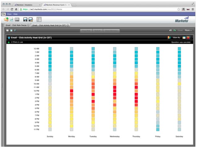 Cree informes avanzados de correo electrónico en Explorador de ingresos, como el informe Cuadrícula de calor de actividad de clic. Este informe muestra a insight el día y la hora en que las personas hacen clic en los vínculos de los correos electrónicos.