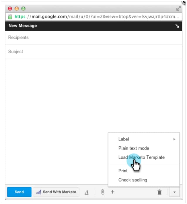 Si usa Marketo Sales Insight, así como Gmail, puede instalar nuestro nuevo complemento Gmail a través de la tienda Chrome. El complemento le permite registrar mensajes con Marketo, cargar plantillas de correo electrónico de Marketo y enviar mensajes con las funciones de seguimiento de Marketo.