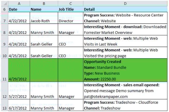 Ahora puede exportar los datos en el Analizador de influencia de oportunidades a Excel. Cada archivo Excel exportado contiene todas las interacciones de marketing de todos los posibles clientes (incluidos los que no tienen una función en la oportunidad), así como todas las oportunidades de la cuenta seleccionada en el analizador. Las filas de oportunidad se resaltan en verde. Puede usar las capacidades nativas de filtrado de datos de Excel si necesita centrarse en posibles clientes o actividades de marketing específicas.