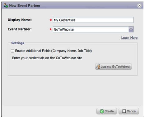 Puede sincronizar Nombre de empresa y Puesto desde su formulario de Marketo a GoToWebinar. Para habilitar estos campos adicionales, vaya a Socios de eventos y marque "Habilitar campos adicionales".