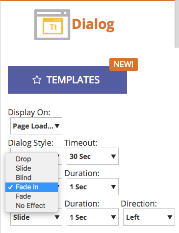 Establezca los efectos de animación para la campaña web de Dialogue para personalizar cómo aparece una campaña al entrar o al salir de la página web. Puede seleccionar entre 6 efectos diferentes y controlar el tiempo y la dirección del cuadro de diálogo.