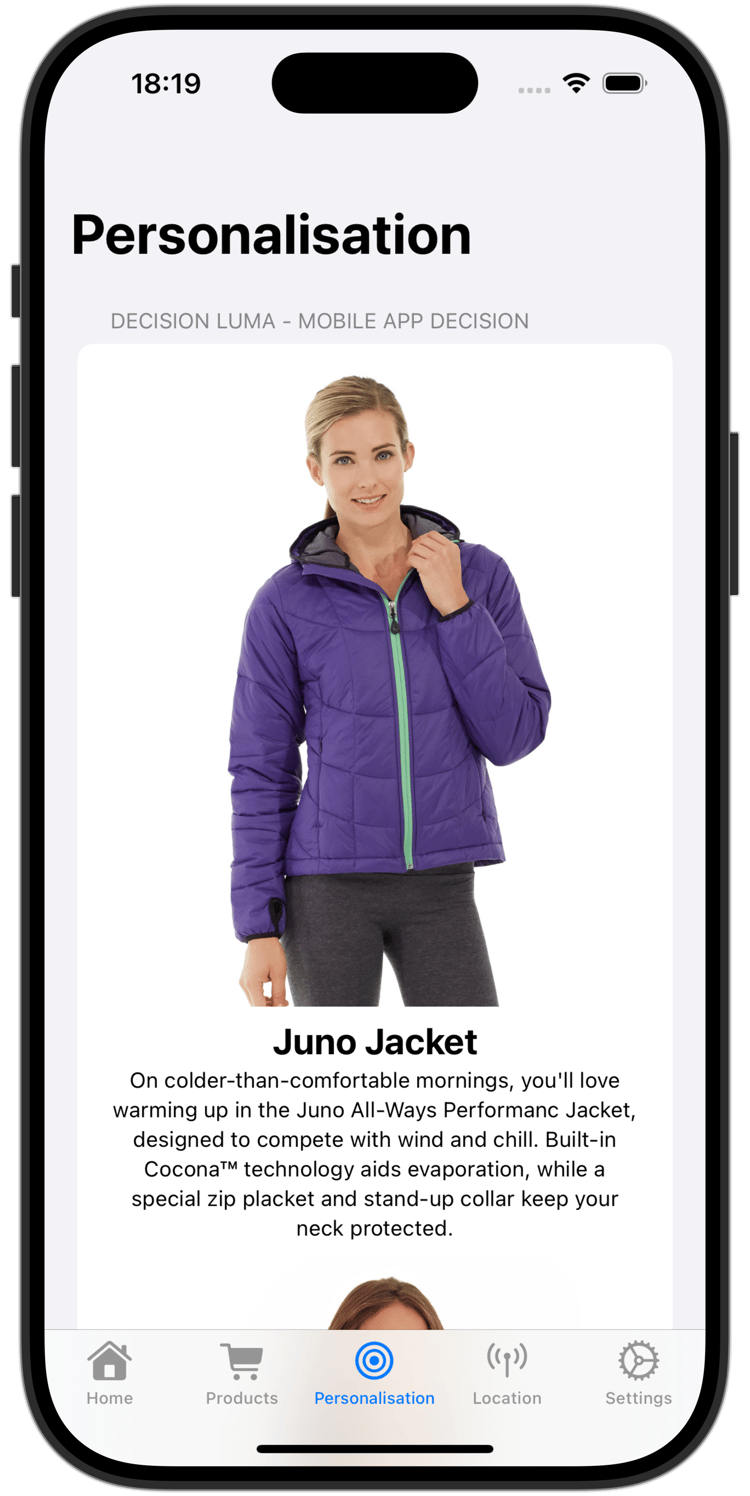 Desplácese hasta la parte superior y verá dos ofertas aleatorias mostradas de la colección que ha definido en el mosaico DECISION LUMA - MOBILE APP DECISION.