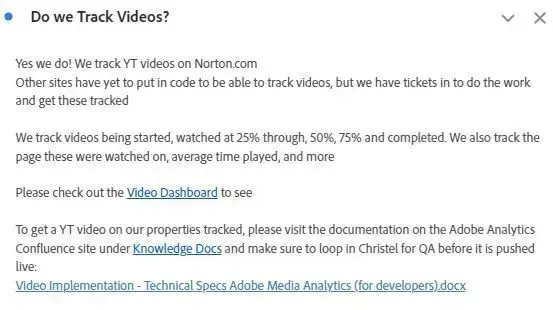 Al igual que muchos administradores, dirijo un centro de información interno (Confluencia o similar) para Adobe Analytics. Con el tiempo, me harté de responder a las mismas preguntas una y otra vez y necesitaba una manera más fluida de llegar a la gente sin tener la sensación de estar molestándola todo el rato. Necesitaba repositorios para información que fuera menos estática.