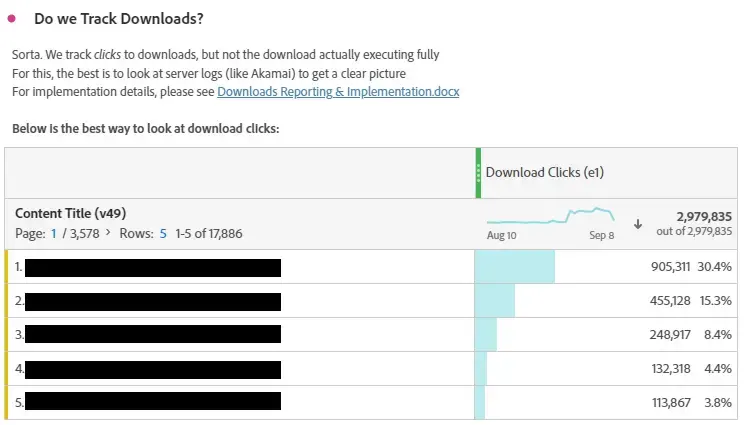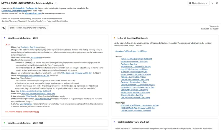 Abarca nuestros paneles de nuevas funcionalidades, seguimiento y vitales. Los hipervínculos de los informes de texto (o de la parte superior de otros informes al hacer clic con el botón derecho y editar la descripción) le permiten crear vínculos a otros paneles de Adobe Analytics o de la página de versión de funciones de Adobe.