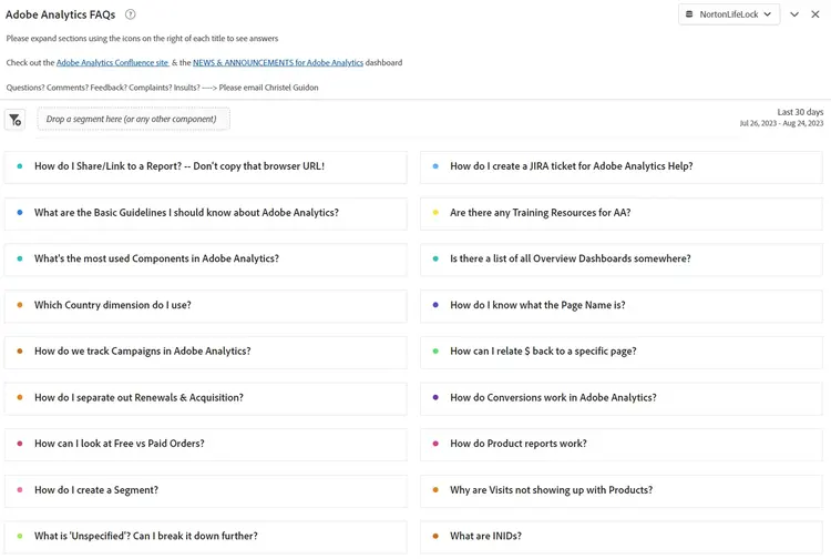 En Gen Digital, nuestras preguntas frecuentes se centran en el uso personalizado de Adobe Analytics, no en conceptos básicos. Para enviar por correo electrónico vínculos a preguntas más frecuentes, haga clic con el botón derecho, seleccione “obtener vínculo de visualización” y comparta la URL personalizada. Esto resalta el contenido exacto para los usuarios. Utilice tablas de forma libre para ilustrar los datos y añada más explicaciones con “editar descripción”.