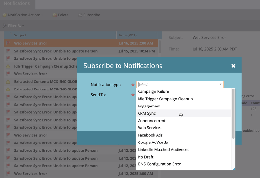 1. Datos en tiempo real: los paneles proporcionan una visibilidad en tiempo real del estado de sincronización, las tendencias del registro de asuntos pendiente y los errores, lo que permite identificar y resolver los problemas inmediatamente. La monitorización de estos paneles evita que los problemas se intensifiquen y garantiza que las campañas no se vean afectadas.