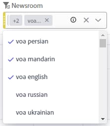 Las nuevas funciones de estos desplegables también han facilitado la segmentación de los datos. Los desplegables dinámicos actualizan otros desplegables basándose en la selección del usuario a uno anterior. Por ejemplo, si se selecciona una sala de redacción, se actualizará la lista desplegable de países en función de los países que hayan visitado el sitio web de esa sala de redacción. Esta función hace que una lista potencialmente larga (como países) sea menos abrumadora para los usuarios finales de Workspace Y evita errores porque una combinación de país y sala de prensa no arroja ningún resultado.
