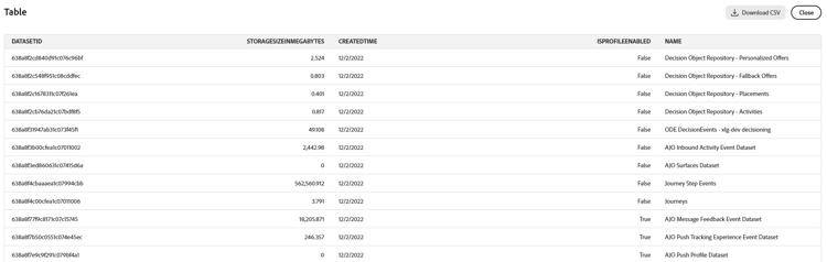 Indicación: Enumerar los conjuntos de datos habilitados para el perfil, su tamaño, si está habilitado para el perfil y, cuándo se crearon, ordenados por tamaño descendente. Excluir conjuntos de datos del sistema. Añadir a la lista el flujo de datos.