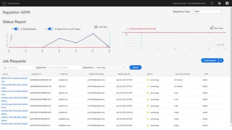 Obtenga información sobre cómo crear solicitudes de privacidad en la interfaz de usuario y monitorizar o revisar su estado en el panel.