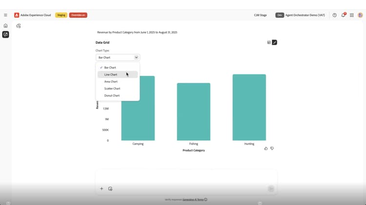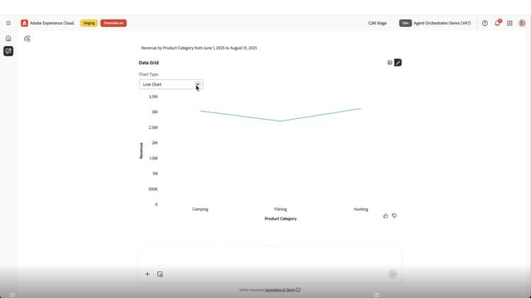 El agente de Data Insights vive dentro de la interfaz de Adobe Experience Cloud, a la que se puede acceder desde la barra lateral del asistente de IA mientras trabaja en una aplicación o desde una vista de pantalla completa.