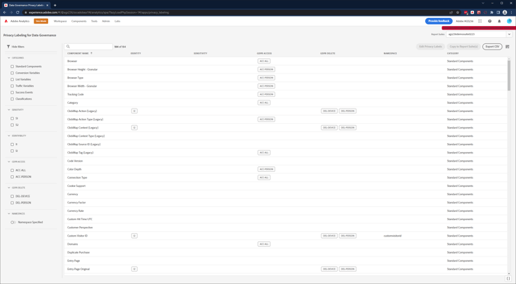 Vous pouvez télécharger un fichier CSV contenant toutes les définitions d’étiquettes actuelles pour toutes les variables de la ou des suites de rapports sélectionnées. Nous recommandons à votre équipe juridique de passer en revue vos choix d’étiquetage. Cette option facilite la vérification. En effet, au lieu d’effectuer la vérification lorsque vous êtes connecté à l’interface utilisateur Gouvernance des données, vous pouvez partager le fichier .CSV avec celle-ci.