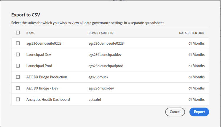Sélectionnez une ou plusieurs suites de rapports pour lesquelles vous souhaitez exporter tous les paramètres de gouvernance des données.