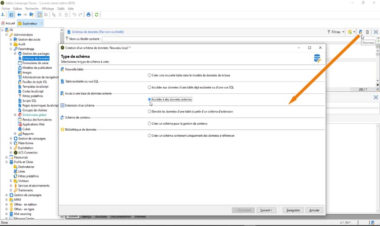 Cliquez sur le bouton Nouveau au-dessus de la liste des schémas de données et sélectionnez Accéder à des données externes.