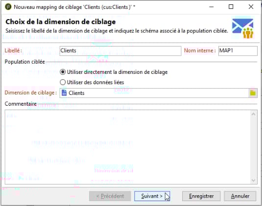 Créez un nouveau mapping de diffusion et sélectionnez la dimension de ciblage, par exemple le schéma que vous venez de créer.