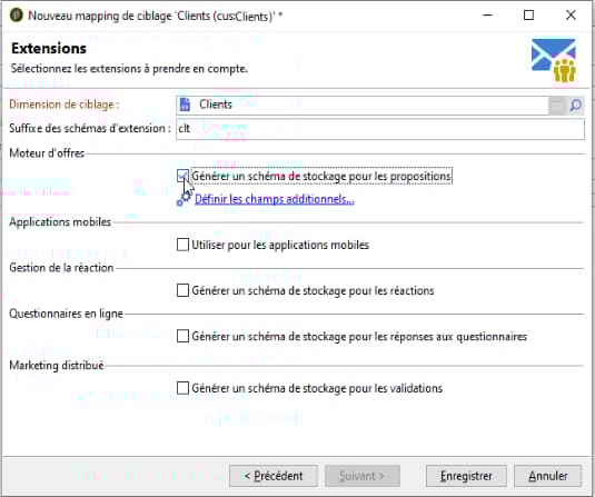 Indiquez les paramètres relatifs au stockage des informations, et notamment le suffixe des schémas d'extension, afin de les identifier facilement.