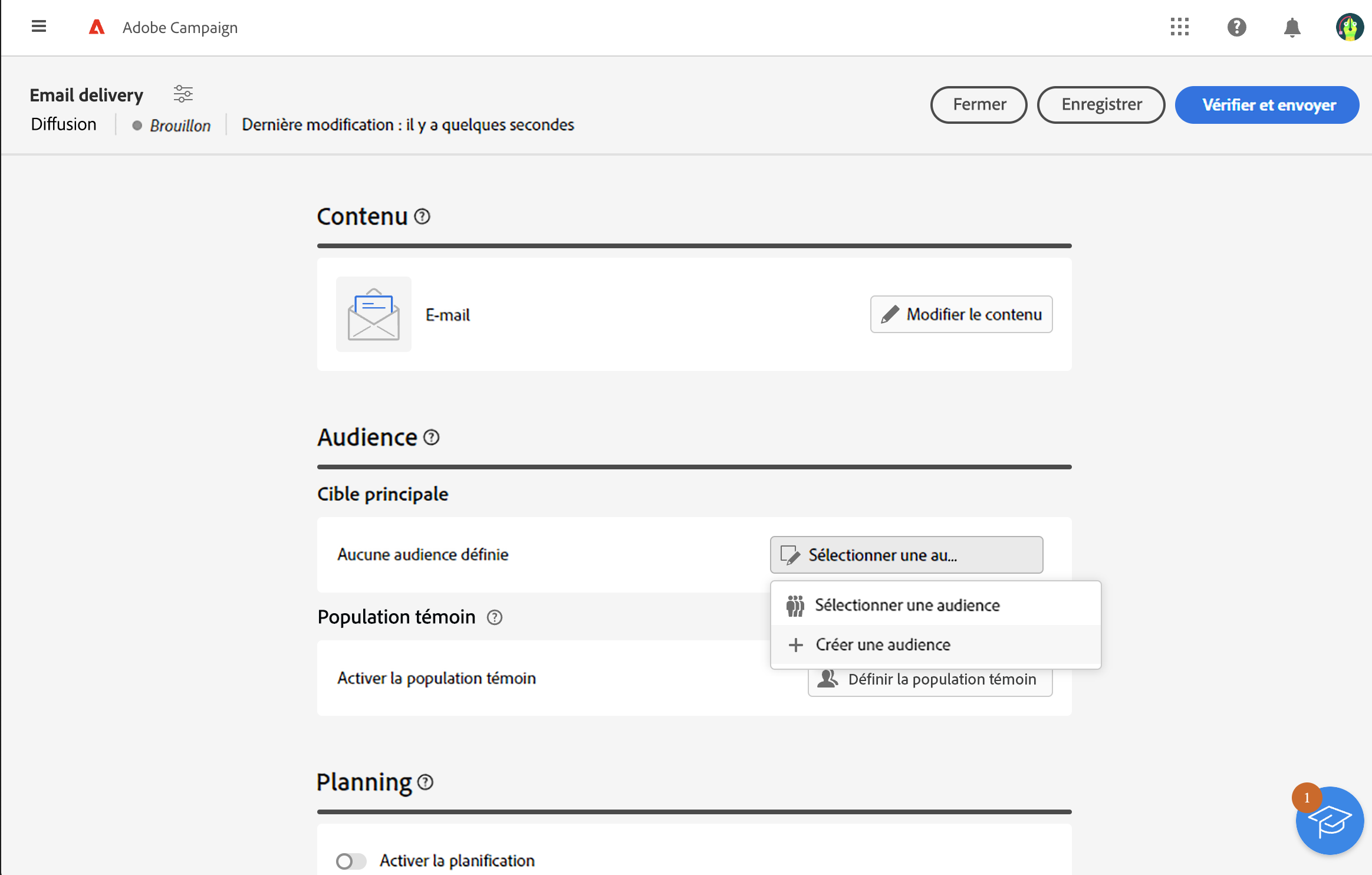 Vous pouvez également définir une population témoin afin de mesurer l’impact de vos campagnes. La population témoin ne reçoit pas le message. Vous pouvez ainsi comparer le comportement de la population qui a reçu le message avec celui des contacts qui ne l’ont pas reçu. En savoir plus.