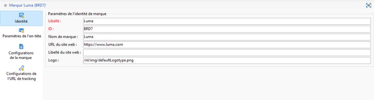 Une identité qui permet d'identifier et de personnaliser votre marque. Cette section contient les champs suivants :