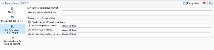 Le paramètre Configurations de marque définit les serveurs utilisés pour le tracking ainsi que l’accès aux pages de destination. Cette section contient les champs suivants :
