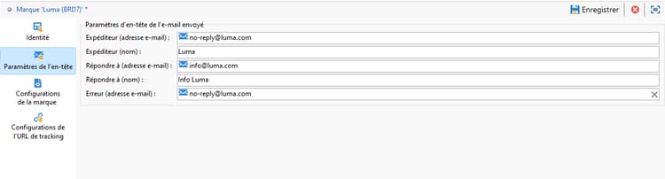 Paramètres d'en-tête des emails envoyés qui permettent de personnaliser les informations qui seront visibles par les destinataires de vos campagnes. Cette section contient les champs suivants :