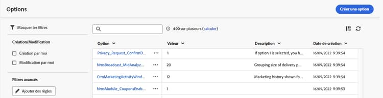 Adobe Campaign Web propose des options techniques qui vous permettent de configurer l’application de manière plus spécifique. Certaines de ces options sont intégrées, tandis que d’autres peuvent être ajoutées manuellement selon vos besoins.