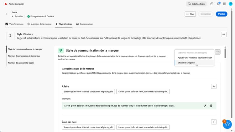 Dans Adobe Campaign Web, les utilisateurs et utilisatrices peuvent saisir et organiser manuellement les informations de marque ou charger des documents de directives de marque pour une extraction de données automatique.
