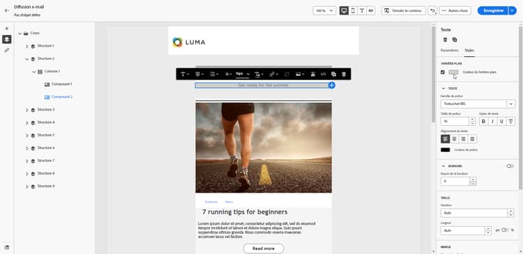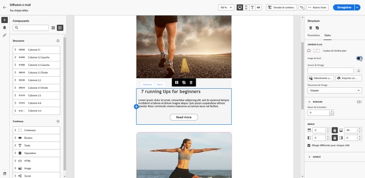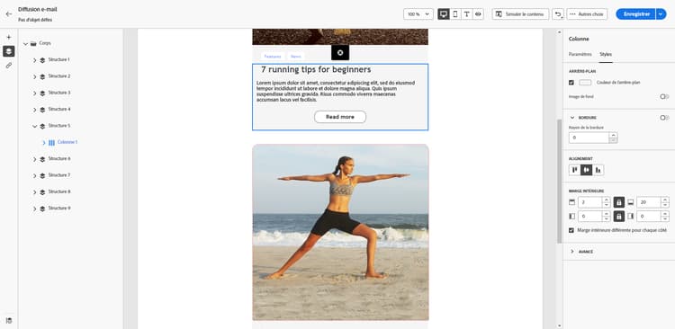 note note NOTE Il s'agit du cas pratique le plus courant. Adobe vous recommande de définir les couleurs d’arrière-plan au niveau des colonnes afin de profiter d’une plus grande flexibilité lors de l’édition de l’ensemble du contenu d’e-mail. Vous pouvez également définir une image de fond au niveau des colonnes, mais cette option est rarement utilisée.