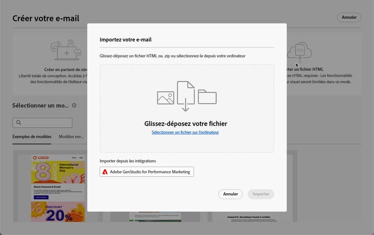 Dans la page d’accueil du Concepteur d’e-mail, sélectionnez Importer du HTML et cliquez sur le bouton Adobe GenStudio for Performance Marketing.