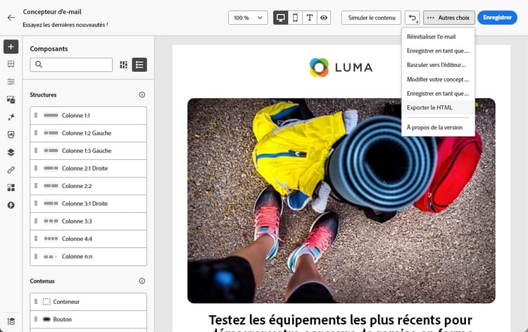 Dans le Concepteur d’e-mail, sélectionnez Exporter en HTML à l’aide du bouton Plus.