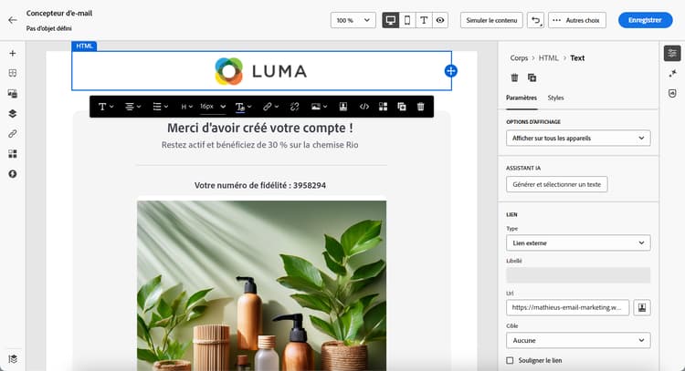 note note NOTE Les expériences GenStudio créées à partir d’un modèle Adobe Campaignsont importées directement dans le Concepteur d’e-mail. Les expériences GenStudio créées sans modèle Adobe Campaign sont importées en mode de compatibilité. Utilisez les outils d’édition de contenu d’e-mail et les champs de personnalisation pour modifier votre e-mail selon vos besoins. Enregistrez votre contenu.