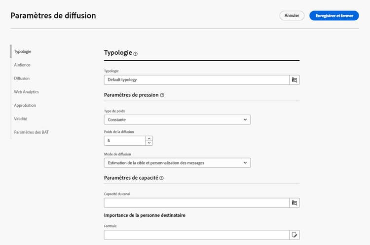 Utilisez le champ Poids de la diffusion pour définir la priorité de diffusion. Chaque diffusion a un poids qui représente son niveau de priorité. Par défaut, le poids d’une diffusion est défini sur 5. Les règles de pression permettent de définir le poids des diffusions auxquelles elles s’appliquent. Le poids peut être fixe ou calculé au travers d’une formule afin de l’adapter en fonction des destinataires. Par exemple, vous pouvez définir le poids d’une diffusion en fonction des centres d’intérêt d’un(e) destinataire.