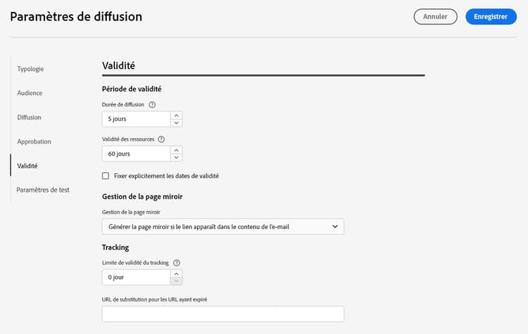 Les paramètres de diffusion d’e-mail sont des paramètres de diffusion techniques définis dans le modèle d’e-mail. Ils peuvent être surchargés pour chaque diffusion.