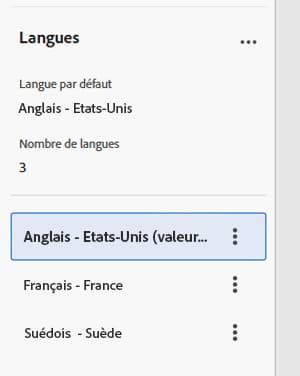 La première langue que vous ajoutez est automatiquement définie comme langue par défaut et le contenu existant devient la version par défaut. Lorsque d’autres langues sont ajoutées, leur contenu est copié à partir de la langue par défaut.