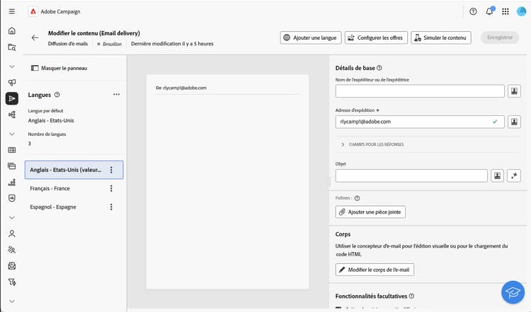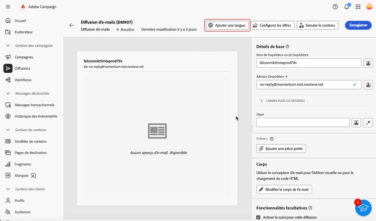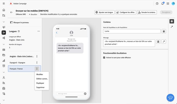 La fonctionnalité multilingue est actuellement disponible pour les e-mails, les notifications push, les messages transactionnels et les SMS.