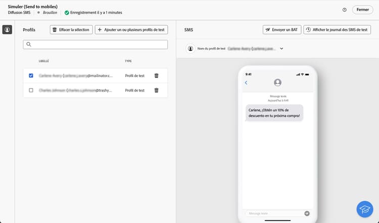 Pour prévisualiser la diffusion, cliquez sur le bouton Simuler le contenu et sélectionnez des profils. Vérifiez que le contenu approprié s’affiche pour chaque profil.