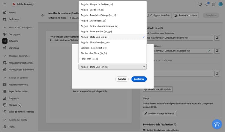 Dans l’interface d’utilisation de Campaign Web, vous pouvez configurer vos diffusions en tant que diffusions multilingues, ce qui vous permet d’envoyer des messages en fonction de la langue préférée d’un profil. Lorsqu’aucune préférence n’est définie, le message est envoyé dans la langue par défaut.