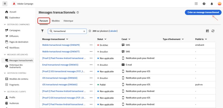 Dans la section Messages déclenchés, accédez à Messages transactionnels et créez un nouveau message transactionnel.