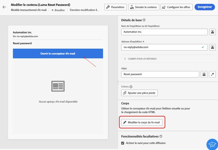 Dans la section Contenu, cliquez sur le bouton Modifier le contenu et définissez le contenu de votre message. Voir cette page.
