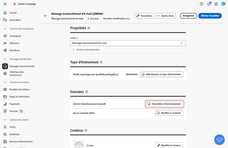 Cette fonctionnalité vous permet de personnaliser les messages transactionnels en liant des champs de la base de données Adobe Campaign au contenu des messages. Vous pouvez sélectionner des mappings de ciblage, des colonnes d’enrichissement et une clé de réconciliation pour garantir une personnalisation précise en temps réel tout en maintenant vos seuils de performances.