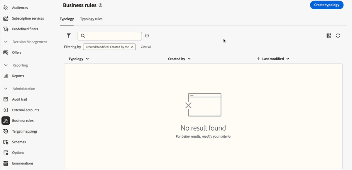 Vous pouvez désormais créer des typologies et des règles de typologie dans l’interface d’utilisation web d’Adobe Campaign. Les typologies permettent de contrôler, de filtrer et de hiérarchiser l’envoi des diffusions. Les typologies permettent de confirmer que les diffusions contiennent toujours certains composants obligatoires (comme un lien de désabonnement ou un objet) ou des règles de filtrage pour exclure des groupes de votre audience (tels que les personnes désabonnées, la concurrence, et la clientèle ne faisant pas partie du programme de fidélité).