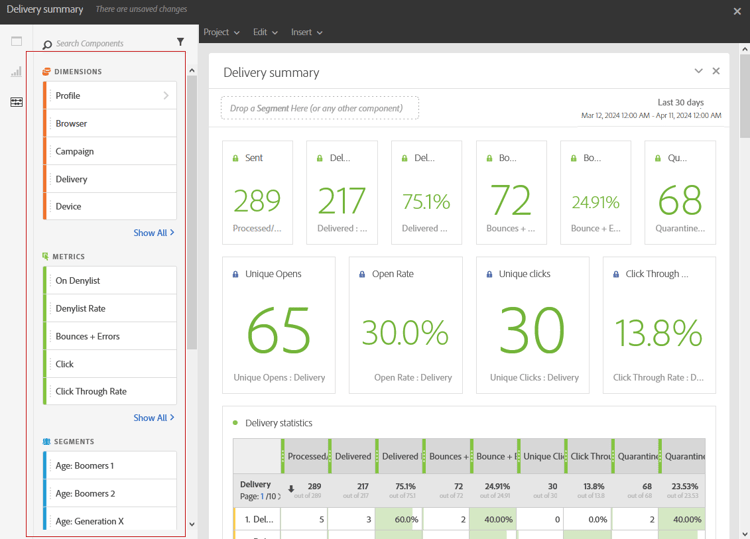Cette catégorie est disponible uniquement lorsque l'administrateur a accepté les conditions générales de l'accord sur l'utilisation des rapports dynamiques qui s'affiche à l'écran. Si l'administrateur refuse les conditions générales de l'accord, les segments ne sont pas visibles dans l'onglet Composants et les données ne sont pas collectées.