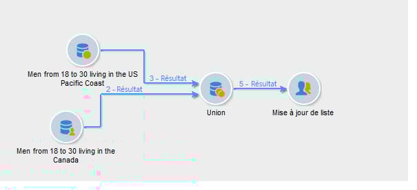Une union permet de regrouper les résultats de plusieurs activités entrantes dans une même cible. La cible est créée avec tous les résultats reçus : toutes les activités antérieures doivent donc être terminées afin que l'union soit exécutée.