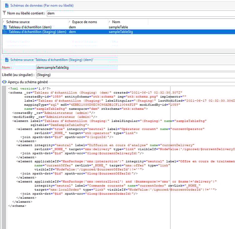 code language-none <srcSchema _cs="Sample Table (dem)" created="YYYY-DD-MM" entitySchema="xtk:srcSchema" img="xtk:schema.png" label="Sample Table" lastModified="YYYY-DD-MM HH:MM:SS.TZ" mappingType="sql" md5="XXX" modifiedBy-id="0" name="sampleTable" namespace="dem" xtkschema="xtk:srcSchema"> <element autopk="true" autouuid="true" dataSource="nms:extAccount:ffda" label="Sample Table" name="sampleTable"> <attribute label="Test Col 1" length="255" name="testcol1" type="string"/> <attribute label="Test Col 2" length="255" name="testcol2" type="string"/> </element> </srcSchema>Pour en savoir plus sur la création de schémas personnalisés, consultez cette page.