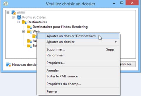Pour créer un nouveau dossier, sélectionnez le noeud à partir duquel vous souhaitez ajouter un dossier et cliquez sur le bouton droit de la souris. Choisissez Ajouter un dossier Destinataires.