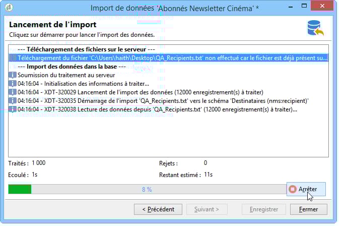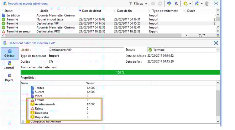 La plupart des opérations de transfert de données génèrent des erreurs qui peuvent être de différentes natures (format de ligne incohérent, e-mail invalide, etc.). Toutes les erreurs et tous les avertissements générés par le moteur d’import sont stockés et liés à l’instance d’import.