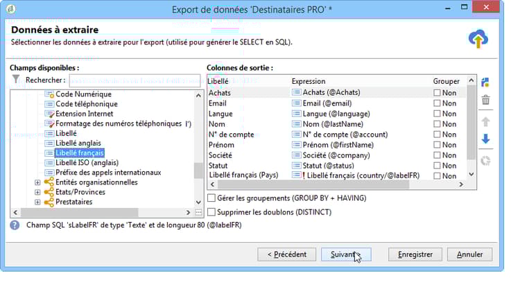 Sélectionnez les champs à exporter. Pour cela :